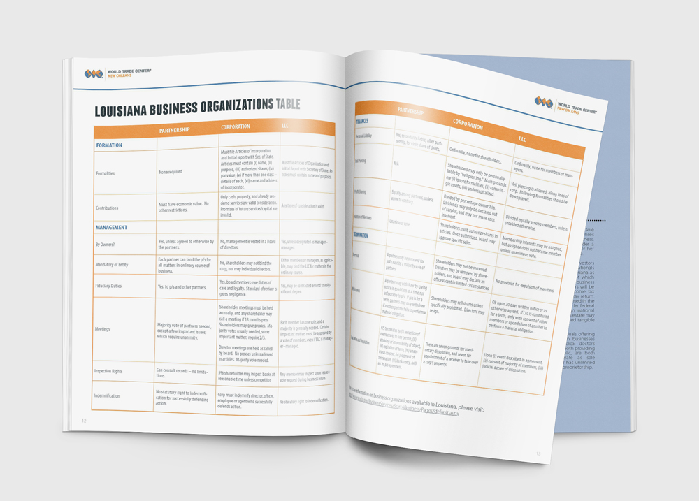 A booklet showing the services of the World Trade Center New Orleans. The booklet incorporates descriptions of different benefits to doing business in Louisiana.