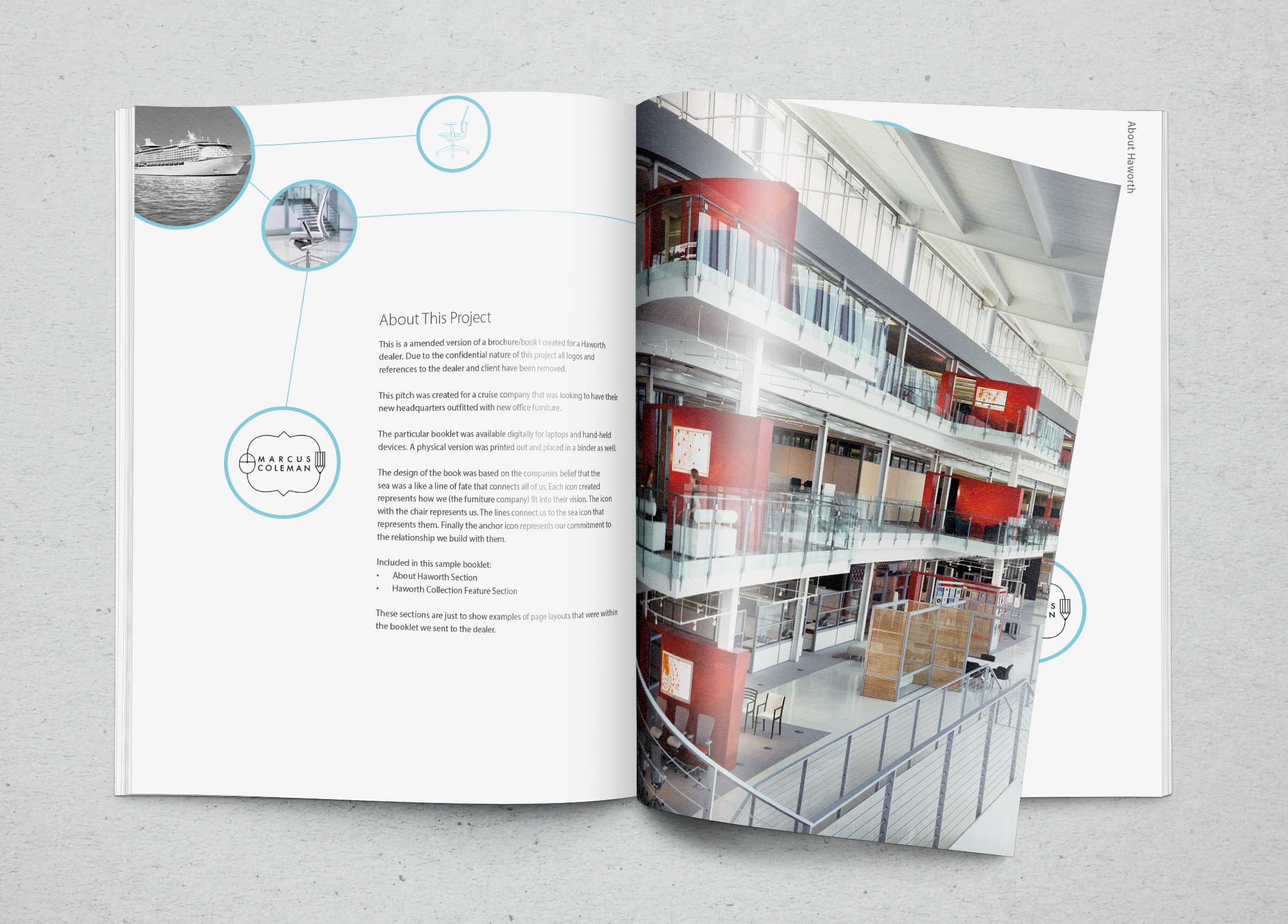 This is a amended version of a proposal book I created for at Haworth. Due to the confidential nature of this project all logos and references to the dealer and client have been removed. This pitch was created for a cruise company that was looking to have their headquarters outfitted with new office furniture.