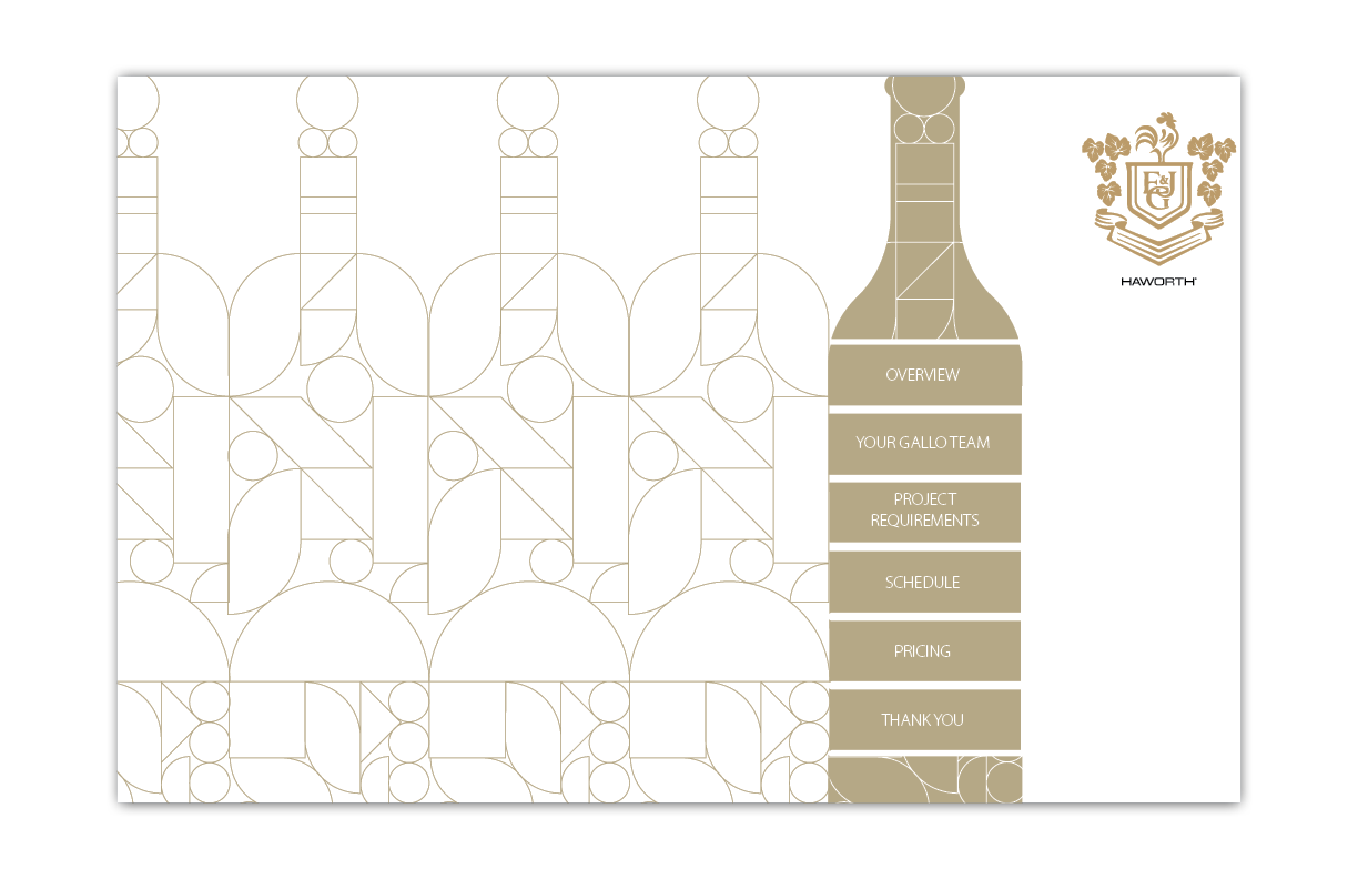 A co-branding booklet for a bid proposal with E&J Gallo Winery on behalf of Haworth. Using the familial grapevine imagery found in E&J's branding, I was able to add elements of Haworth's tangram identity to show unity between the companies.