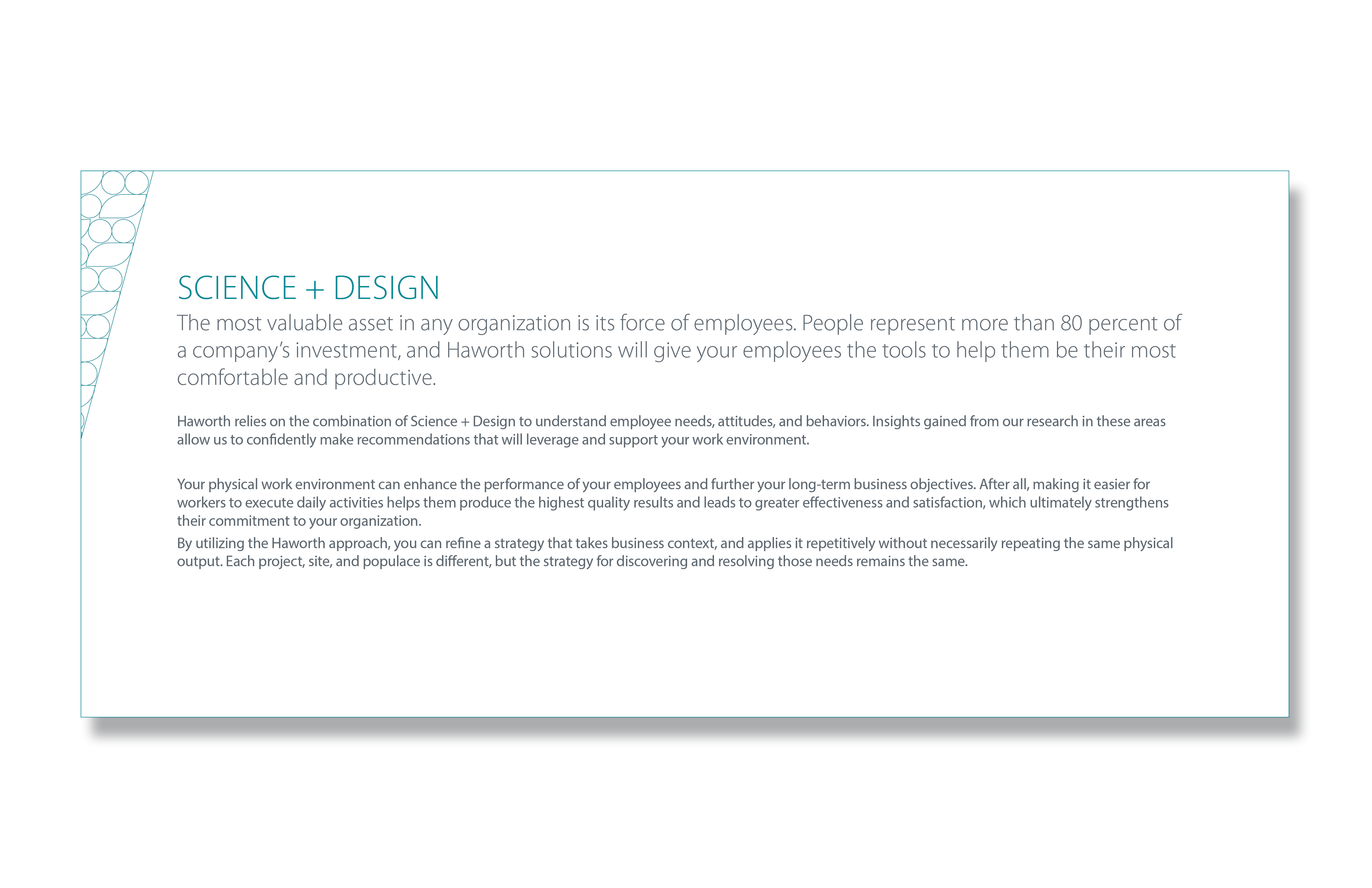 A co-branding booklet for a bid proposal with Sealed Air on behalf of Haworth. The design fuses elements of Haworth's branding standard and Sealed Airs re-branded imagery (which is focused on environmental sustainability)